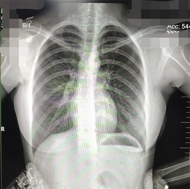 解決:去除金屬飾品及內(nèi)衣后重新按標(biāo)準(zhǔn)體位攝片即可。