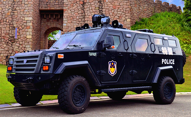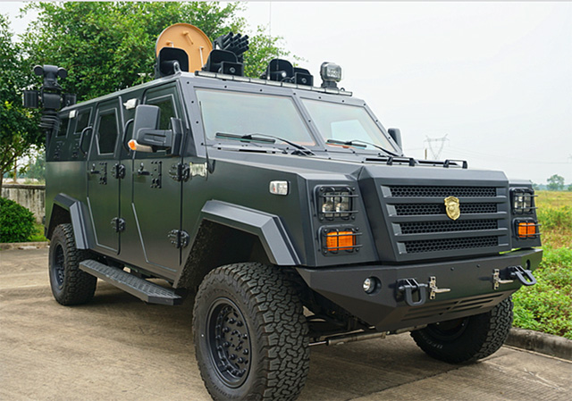國產(chǎn)“黑豹”防暴裝甲運(yùn)兵車是根據(jù)美國進(jìn)口福特E350改裝而成的5噸級防爆裝甲車。該車可搭載8名特警隊員,整車長5.8米,寬2.2米,高2.3米。車身采用進(jìn)口防彈材料制作并采用自主重疊式的防彈結(jié)構(gòu),防護(hù)性能優(yōu)越。該車試用于軍隊、武警、公安、邊防等部門執(zhí)行反恐維穩(wěn)、邊防巡邏、緝毒抓捕等任務(wù)。防暴裝甲運(yùn)兵車該車還有5個車門,以確保隊員快速上下。超大馬力的進(jìn)口發(fā)動機(jī),使得整車動力強(qiáng)勁,最高時速達(dá)140km/h。特警支隊相關(guān)負(fù)責(zé)人介紹:這輛“黑豹”防爆裝甲車可執(zhí)行追鋪、反恐、偵查、巡邏等任務(wù)。防暴裝甲運(yùn)兵車同時配備了防彈輪胎,輪胎在中彈和刮破后任可繼續(xù)前行80多公里。該車車身四面防彈,前后裝有防撞保險杠,每個窗口都安裝了雙層防彈玻璃,車身周圍有8個射擊窗口,在防爆突出過程中可發(fā)揮巨大作用。國產(chǎn)“黑豹”車身上方配有38mm九管催淚炮,催淚炮可進(jìn)行360度旋轉(zhuǎn),最大仰角高達(dá)60度,射程至少200米以上。該車還配置了LED警燈警報系統(tǒng)和升降聚光照明燈,在處突過程中可以給犯罪分子造極大的震懾作用,極大地提升了人民群眾的安全感、滿意度。