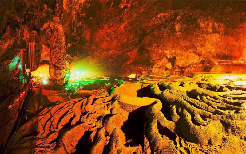 進(jìn)入黃仙洞后,只見洞內(nèi)奇石異景、百態(tài)紛呈,特別是2萬(wàn)平米的邊石池、形似梯田,是黃仙洞最具特色的地方,大家被眼前的景觀深深吸引,情不自禁折服于大自然的鬼斧神工。