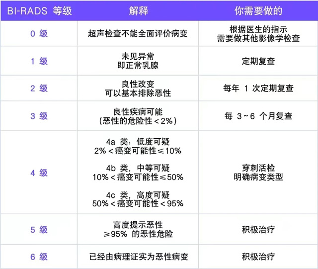 報告出現(xiàn)異常怎么辦?根據(jù)乳腺超聲結(jié)果,可分為以下6類: