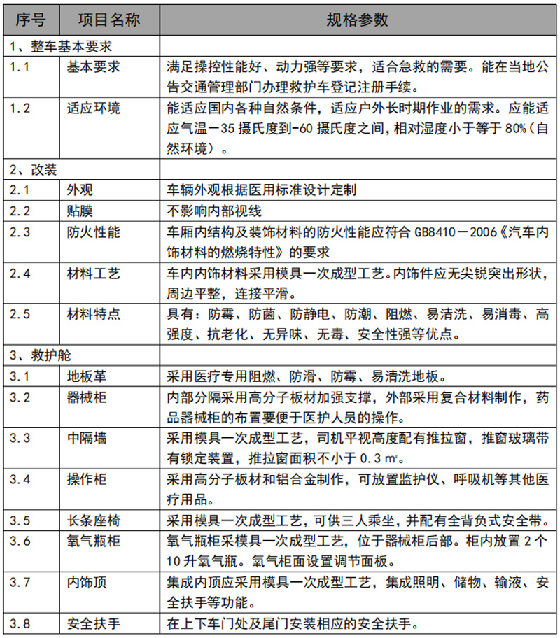 滿足操控性能好、動力強等要求,適合急救的需要。能在當?shù)毓娼煌ü芾聿块T辦理救護車登記注冊手續(xù)??梢允褂酶鞣N自然環(huán)境使用,戶外作業(yè)也不在話下。零下35度到60度都適應(yīng),小于80%濕度環(huán)境。符合GB8410- 2006 《汽車內(nèi)飾材料的燃燒特性》的要求。內(nèi)部分隔采用高分子板材加強支撐,外部采用復(fù)合材料制作,藥品器械柜的布置要便于醫(yī)護人員的操作。采用集成電路控制系統(tǒng),觸摸屏操作,可顯示日期,時間,溫度,濕度,時時監(jiān)控電池電壓,交流電壓,消毒燈開關(guān)及消毒時間的自動控制,排風(fēng)及進風(fēng)控制,吸引器的控制,逆變器控制,照明燈控制。