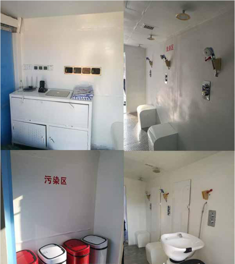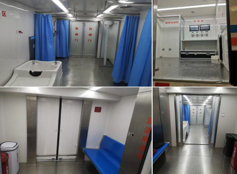 2. 核化污染洗消車空調(diào)系統(tǒng)安裝在車廂與車頭之間;水箱、洗消液箱安裝在車廂外部;車廂防腐密封結(jié)構(gòu),車廂廂體外壁和內(nèi)壁均采用光滑和圓角結(jié)構(gòu),內(nèi)外光潔。車廂內(nèi)包括污染區(qū)、洗消區(qū)、清潔區(qū)、感應(yīng)推拉門、雙開塞拉門、單開塞拉門;污染區(qū)、洗消區(qū)和清潔區(qū)由感應(yīng)推拉門相互隔離;從污染區(qū)進(jìn)入洗消區(qū)以及從洗消區(qū)進(jìn)入清潔區(qū)需經(jīng)過(guò)紅外感應(yīng)平移非接觸式感應(yīng)推拉門;污染區(qū)的入口安裝雙開塞拉門;潔凈區(qū)的出口安裝單開塞拉門;升降平臺(tái)安裝在污染區(qū)入口和清潔區(qū)出口開塞拉門外;污染區(qū)包括洗消用品柜、污染衣物回收箱、排風(fēng)系統(tǒng)、空調(diào)系統(tǒng);洗消區(qū)包括洗眼、洗頭、局部洗消、全身洗消、新風(fēng)系統(tǒng)、排風(fēng)系統(tǒng)、空調(diào)系統(tǒng)、污水排放口和外接污水收集袋;清潔區(qū)包括中控平臺(tái)、核輻射檢測(cè)儀、更衣柜、烘干室、電器柜、新風(fēng)系統(tǒng)、空調(diào)系統(tǒng);核輻射檢測(cè)儀為門柱式輻射儀,安裝在清潔區(qū)感應(yīng)推拉門旁側(cè);人員每通過(guò)感應(yīng)推拉門前由核輻射檢測(cè)儀進(jìn)行輻射水平檢測(cè)及核素檢測(cè)。
