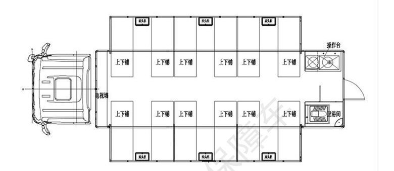 宿營車主要由卡車底盤改裝,集人員輸送和休息為一體,車廂內(nèi)部空間分為住宿間、衛(wèi)生間、廚房 3個部分。E0級標(biāo)準(zhǔn)的環(huán)保材料,高低床可以提供20個床位,高低床拆卸收攏后,人性化配套設(shè)施可在固定車廂位置布置會議桌,形成會議室。衛(wèi)生間在車廂后面,有馬桶、洗手盆、水箱各一個。宿營車基礎(chǔ)上改造了供電系統(tǒng),給水系統(tǒng),排污系統(tǒng),廚房位于車廂前部,配備基本廚房用品。宿營車環(huán)境越來越好具有舒適的就寢環(huán)境的衛(wèi)生設(shè)施。宿營車能夠適應(yīng)普通公路、越野特殊使用環(huán)境,通過可靠性好。